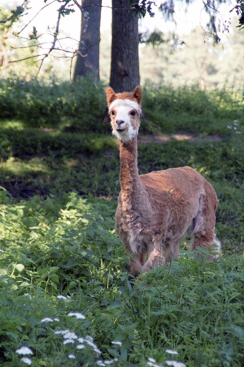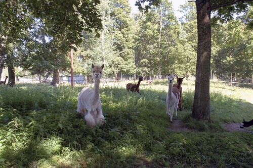 Nej, Hintzegårdens alpackor kan inte beskrivas som annat än lugna och godmodiga. Vi står mitt i flocken och djuren rör sig mjukt och obekymrat mellan oss. Intresserade men aldrig närgångna. Nyfikna, stora ögon följer oss bakom rullgardinslånga ögonfransar. Det är svårt att inte bli charmad av alpackorna som trots sitt exotiska ursprung smälter så väl in i den svenska sensommargrönskan.