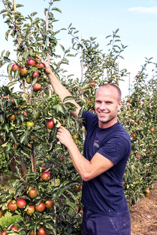 Men inte ens här står tiden stilla. Det har hänt mycket inom den professionella äppelodlingen under 2000-talet. De klassiska kronbildande fruktträden är sedan länge borta ur bilden. Idag formar äppelträden istället lättskötta och högproduktiva odlingshäckar, berättar Fredrik: