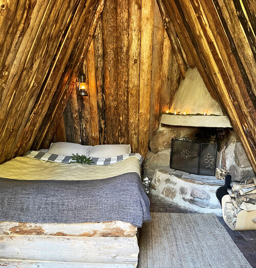 I nästa steg lastade de på jord med hjälp av en grävmaskin, och lade för hand på gräs och torv, vilket var en tidsödande del i bygget. Inne i kojan är det mysigt och ombonat, här finns en säng med plats för två, eldstad, ved och många små ljus.