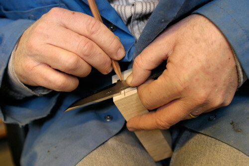 - Staffan har sågat till en lämplig bit masurbjörk och ritar ut var bladet ska passas in.