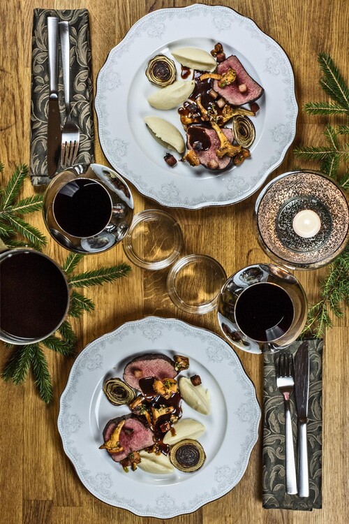 Om du tajmat allt rätt nu, så är alla tillbehören varma och redo att läggas upp precis när köttet vilat klart. Lägg upp maträtten som på bilden, eller tranchera upp köttet och lägg på ett stort fat med syltade kantareller ovanpå. Servera sås, puré och övriga tillbehör i skålar. Servera och njut!