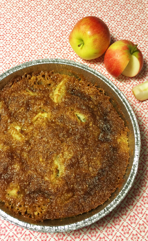 Skala äpplena och skär dem i klyftor. Lägg klyftorna i en smord form. Fördela smeten över äppelskivorna. Grädda pajen i mitten av ugnen i ca 30 minuter.