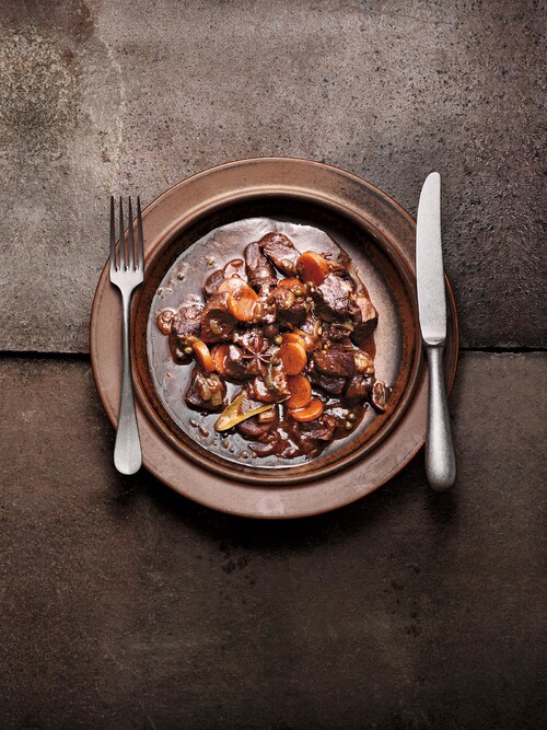 Låt grytan koka 2–3 timmar tills köttet är mört. Se till så att vätskan hela tiden täcker köttet. Smaka av med salt och red av med maizena när köttet är klart. Servera gärna med pressad potatis eller