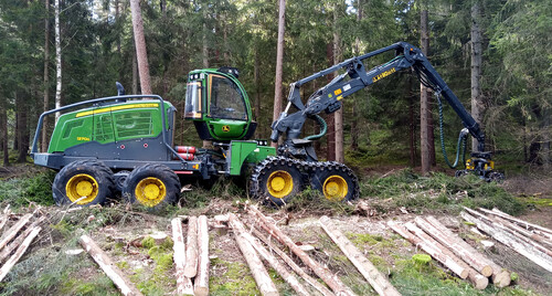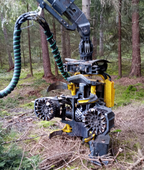 Den 8-hjuliga maskinen har ett skonsammare marktryck och bättre stabilitet. Skördaren är utrustad med en 11,7 meters kran med IBC, som står för Intelligent bom control. Aggregatet är ett H424 extrautrustat för flerträdshantering.