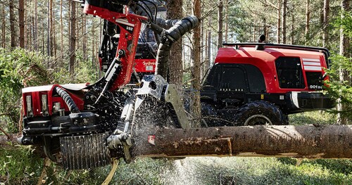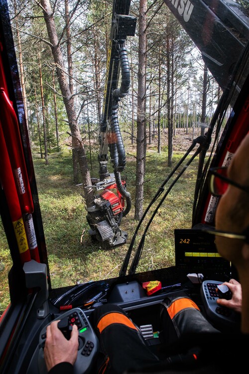Solen kikar då och då fram mellan molnen den här kylslagna vårdagen i slutet av april. Beståndet som ska gallras ligger några kilometer norr om Gislaved. På plats är ett av Sydveds starka lag – Sydvedaren Mattias Svensson, Daniel Josefsson och Timmy Rydberg som jobbar för entreprenören LG Hultsjö skogsmaskiner och skotarföraren Toimi Rumpunen på egna företaget Toimis skogstjänst.