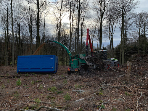 Här på bilden ser vi en traktorbogserad flismaskin som står ute i terrängen och flisar. Risvältan kommer från bokgallringen (i bakgrunden) som är gjord för ca ett år sen. Bilden är tagen på södra sidan av Hallandsåsen, norr om Ängelholm i Nordvästra Skåne.