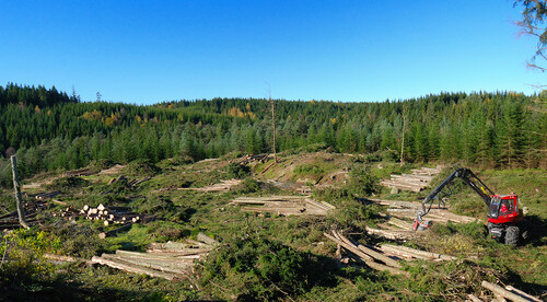 Skördaren upparbetar timmer och massaved i din skog. Samtidigt samlas grenar, toppar och träddelar (groten) i luftiga högar på hygget.