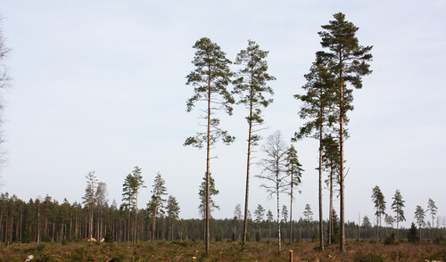 Undvik att lämna träden spridda på hyggesytan, utan lämna hellre träden i grupper som tillsammans bryter de stora kala ytorna. Träden som lämnas ska återspegla trädslagsfördelningen som fanns innan avverkningen.