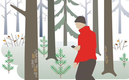 Du kan också markera olika platser på kartan. Exempel: På en tur i skogen ser du vindfällen som behöver upparbetas. Markera platsen med en kartnål, gör en notering och komplettera med en bild om du vill. Informationen kan du sen skicka vidare till din Sydvedare. Eller bara meddela andra berörda om läget.