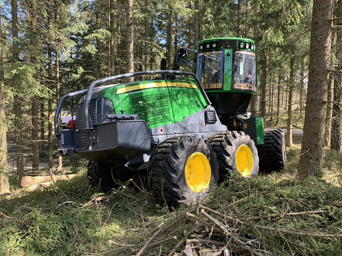 Skördaren är 8-hjulig för att skona både mark och förare, den har även IBC, kranspetsstyrning.