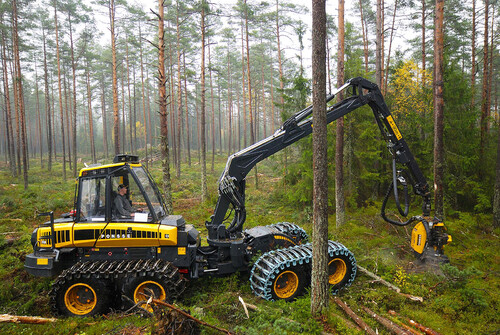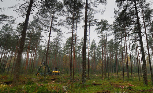 I den täta dimman över mossen jobbar sig skördarföraren Mikael Petersson fram i en välrisad stickväg.