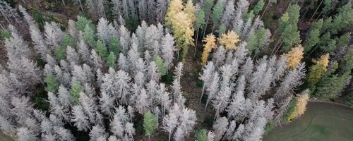 Flyger du med drönare över din fastighet kan du få en överblick över eventuella områden med döda träd. Uppifrån kan du tydligt se de döda granarna som är helt grå eller vita.
