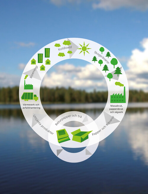 Då kommer vi också in på den viktiga funktion produkterna från skogen har genom att lagra kol under lång tid. Ta exemplet med ett trähus som binder kolet i virket under hela sin livstid. När produkterna från skogen slutligen bränns eller förmultnar frigörs koldioxid som tas upp av träden och återförs till kretsloppet.