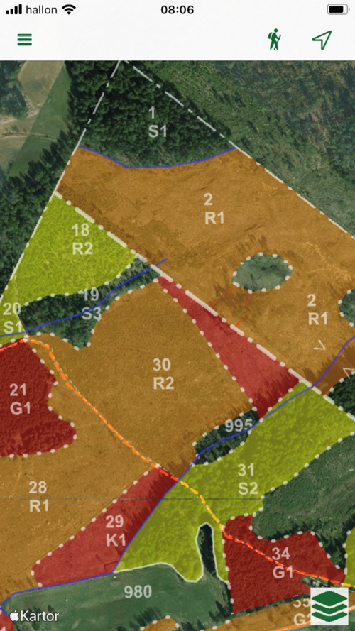 Han kollar även upp information från artdatabanken, riksantikvarieämbetet och Skogsstyrelsen som berör fastigheten. Sedan har han sin förtolkade avdelningsindelning med sig i paddan ut i fält som han justerar vid behov och samlar in data som ålder, diameter, trädslagsblandning med mera.