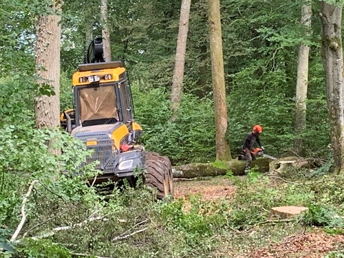 Maskinen är en Ponsse Ergo från entreprenören UGB skogsservice som utför den maskinella delen och som stöttas upp av Anders Croon som är manuellhuggare och som hjälper till med de riktigt grova och svårkvistade träden. Inköparen Martin Ohlsson passade på att besöka avverkningsgruppen så här veckan innan några skulle gå på semester för att bjuda på en fika.