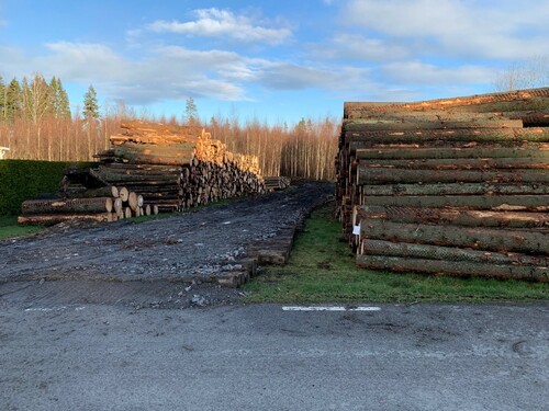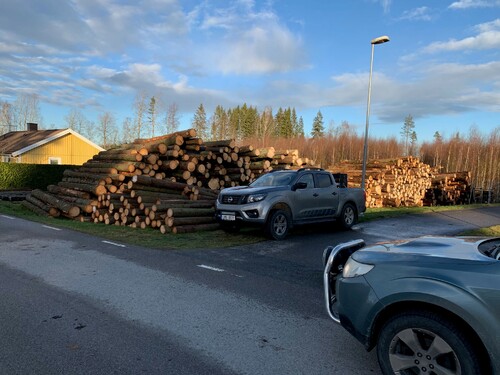 I detta fallet har vi använt kommunens gräsmatta för att lägga upp virket på från en större avverkning. Det var det enda sättet för att kunna få ut virket till en farbar och bra väg ifrån avverkningen.
