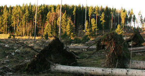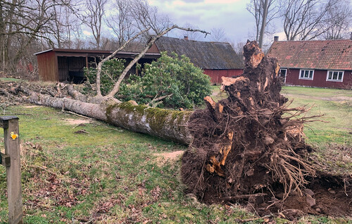 Den här asken i trakterna av Perstorp föll offer för stormen Laura som drog fram mitt på dagen torsdagen den 12 mars. Asken som var drabbad av askskottssjukan hade ett minimalt rotsystem som gjorde att den inte orkade stå emot de kraftiga stormvindarna.