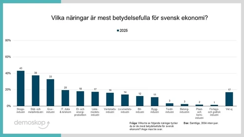 I undersökningen, där över 3000 svenskar intervjuats, väljer 43 procent skogsindustrin som en av de viktigaste näringarna – den högsta siffran av samtliga branscher som ingick i mätningen.