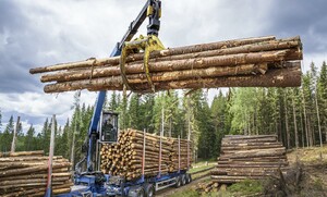 Vid upplagsplatsen hämtas virket upp av en timmerlastbil för vidare transport till industrin.